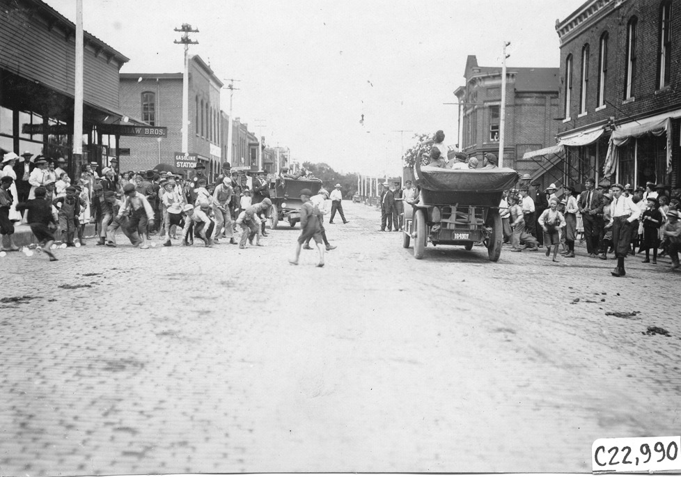 View of tour participants on downtown street in front of businesses, a man in car is throwing something up in the air and children are running to catch it, at the 1909 Glidden Tour. Photo edges cut unevenly.