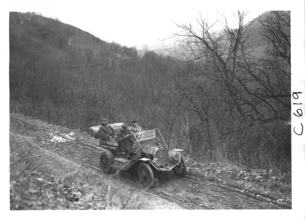 E-M-F car on rural road in the mountains, on pathfinder tour for the 1909 Glidden Tour