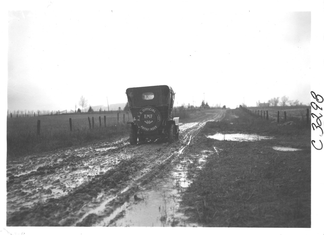 Favorite this☆ E-M-F car on muddy, rural road, on pathfinder tour for 1909 Glidden Tour Description: View of E-M-F car on muddy, rural road, on pathfinding tour for the 1909 Glidden Tour. Details Resource ID: EB01g820 Creator: Krohn, William Subject: Glidden Tour (1909) Automobile driving--Competitions--United States Automobiles E-M-F Company Photographers--New York (State)--New York Photographic prints Date Issued: 1909-04 Format: 1 photographic print ; 5 x 7 in. Member of: National Automotive History Collection Lazarnick Collection Filing Location: Tours--Glidden Tour, 1909 Negative Number: Negative #C3298 Rights: Physical rights are retained by DPL. Copyright is retained in accordance with U.S. copyright laws.