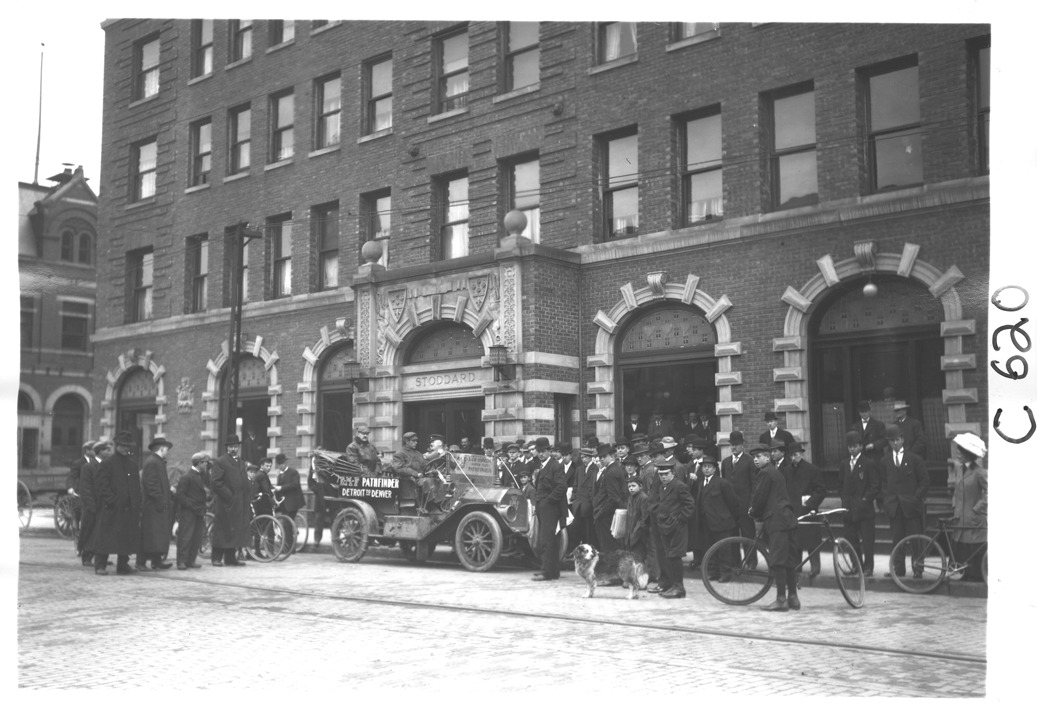 View of E-M-F car in front of Stoddard Hotel in La Crosse, Wisconsin, men, boys and a dog around vehicle, on pathfinding tour for the 1909 Glidden Tour.
