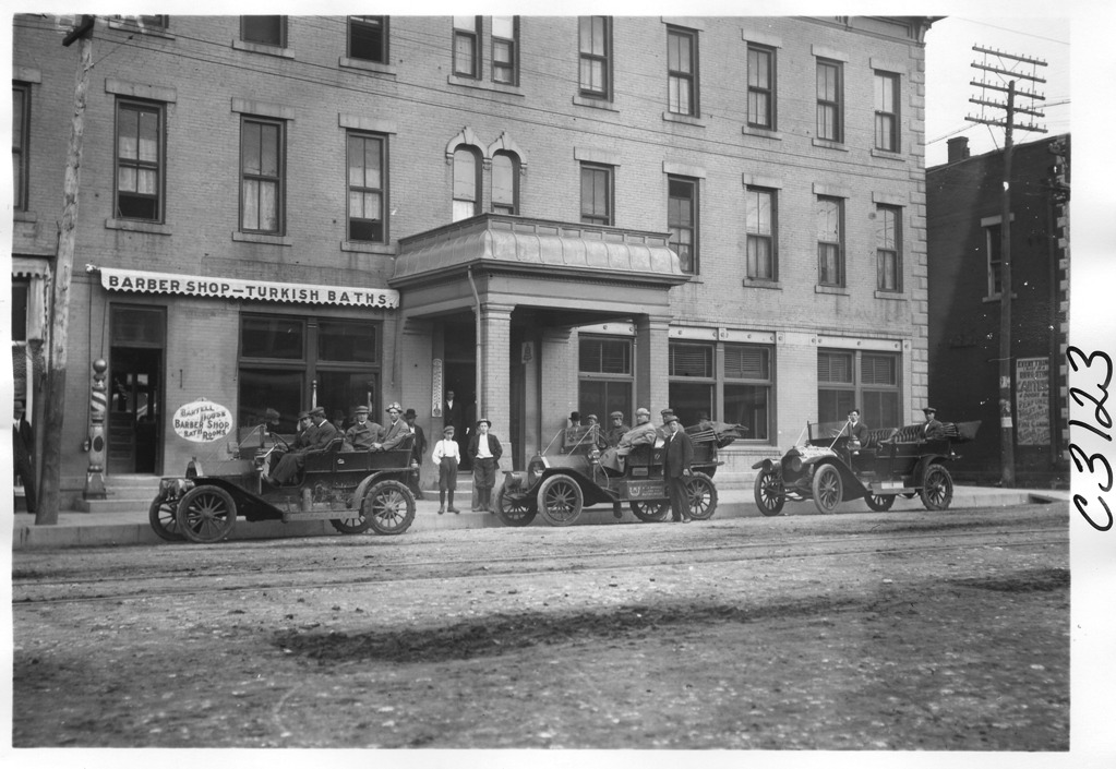 View of motorists with an E-M-F car and two other cars, posing in front of the Bartell House hotel on N. Washington Street in Junction City, Kansas during the pathfinding tour for the 1909 Glidden Tour. Sign on building reads: "Bartell House, barber shop, bath rooms." "Barber shop, Turkish baths" printed on awning.