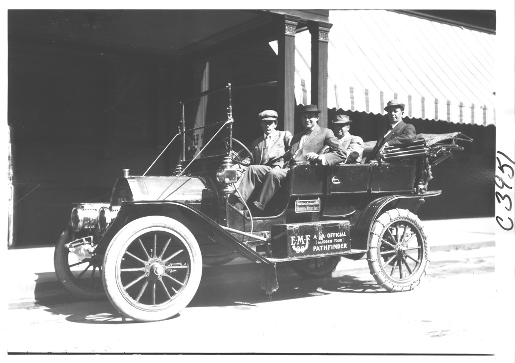 View of E-M-F car parked by building in shadow, large striped awning visible, four men in car, including Dai Lewis, posing for camera, on pathfinding tour for the 1909 Glidden Tour.