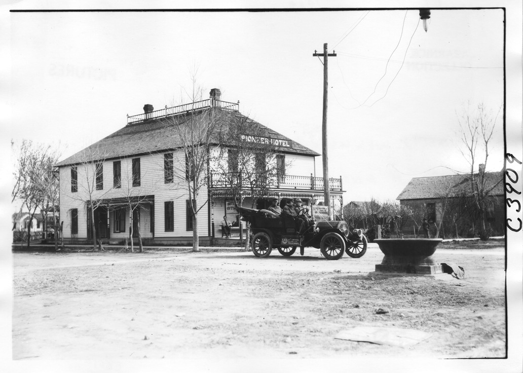 View of E-M-F car in front of a wooden building with first and second floor porches, sign "Pioneer Hotel" on roof, stone container on roadway, possible watering trough, on pathfinding tour for the 1909 Glidden Tour.