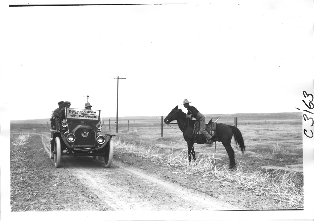 Favorite this☆ E-M-F car on rural road encounters man on horseback, on pathfinder tour for 1909 Glidden Tour Description: View of E-M-F car with driver and two passengers encounters man on horseback on rural road , on pathfinding tour for the 1909 Glidden tour. Details Resource ID: EB01g920 Subject: Glidden Tour (1909) Automobile driving--Competitions--United States Automobiles E-M-F Company Photographic prints Date Issued: 1909-04 Format: 1 photographic print ; 5 x 7 in. Member of: National Automotive History Collection Lazarnick Collection Filing Location: Tours--Glidden Tour, 1909 Negative Number: Negative #C3163 Rights: Physical rights are retained by DPL. Copyright is retained in accordance with U.S. copyright laws.