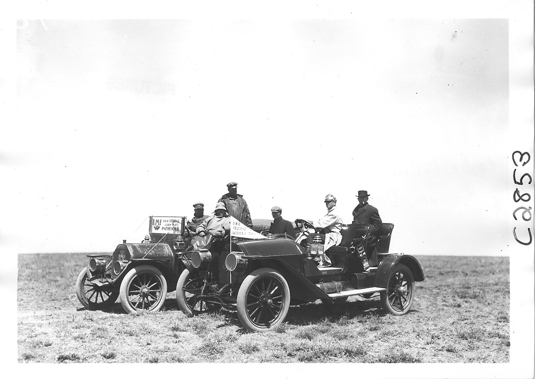 Favorite this☆ E-M-F and Denver Motor Club escort cars parked off road, on pathfinder tour for 1909 Glidden Tour Description: View of E-M-F car and Denver Motor Club escort car parked side by side off road, on pathfinding tour for the 1909 Glidden tour. Details Resource ID: EB01g940 Subject: Glidden Tour (1909) Automobile driving--Competitions--United States Automobiles E-M-F Company Photographic prints Date Issued: 1909-04 Format: 1 photographic print ; 5 x 7 in. Member of: National Automotive History Collection Lazarnick Collection Filing Location: Tours--Glidden Tour, 1909 Negative Number: Negative #C2853 Rights: Physical rights are retained by DPL. Copyright is retained in accordance with U.S. copyright laws.