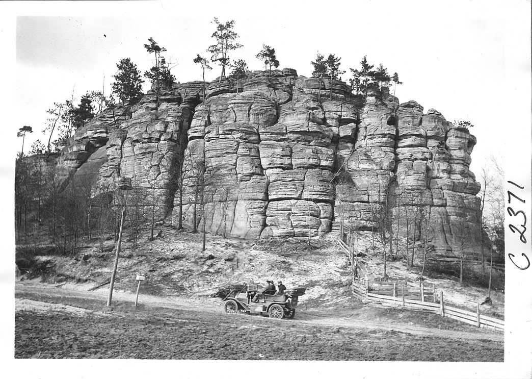 Favorite this☆ E-M-F car passing large rock formation, on pathfinder tour for 1909 Glidden Tour Description: View of E-M-F car passing a large rock formation, on pathfinding tour for the 1909 Glidden tour. Details Resource ID: EB01g944 Creator: Krohn, William Subject: Glidden Tour (1909) Automobile driving--Competitions--United States Automobiles E-M-F Company Formations (Geology) Photographers--New York (State)--New York Photographic prints Date Issued: 1909-04 Format: 1 photographic print ; 5 x 7 in. Member of: National Automotive History Collection Lazarnick Collection Filing Location: Tours--Glidden Tour, 1909 Negative Number: Negative #C2371 Rights: Physical rights are retained by DPL. Copyright is retained in accordance with U.S. copyright laws.