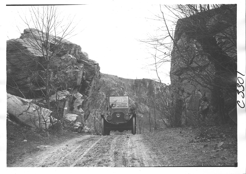 View of E-M-F car on mountain road, on pathfinding tour for the 1909 Glidden tour.
