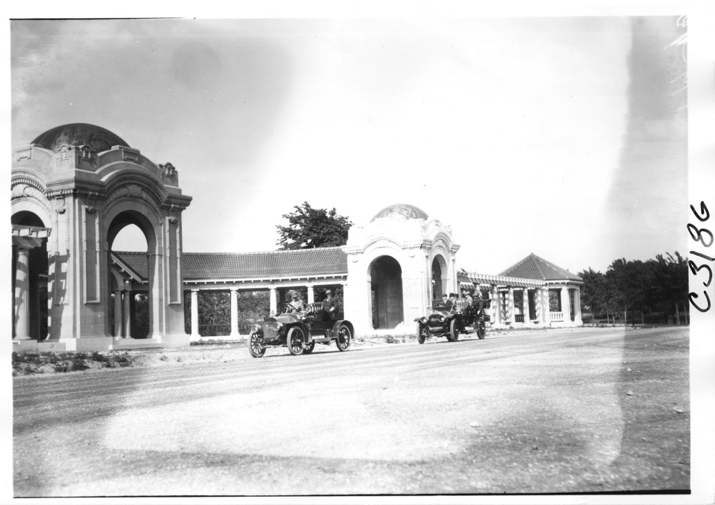 View of two Studebakers with drivers and passengers stopped alongside a columned, tile-roofed walkway, with domed pavilions, on pathfinding tour for the 1909 Glidden tour.