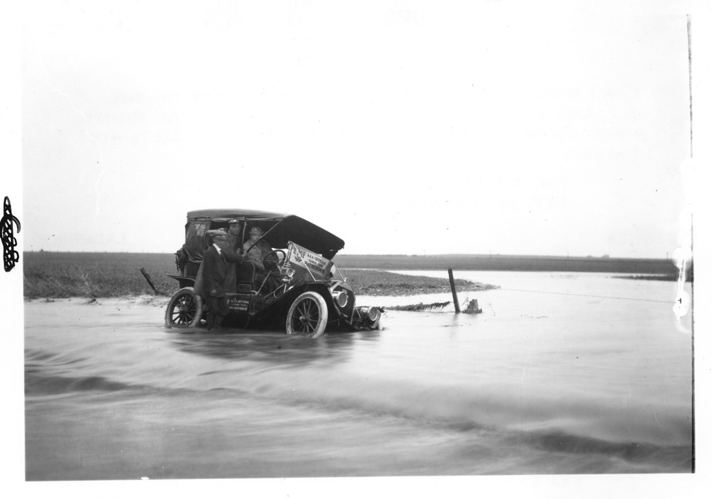 View of E-M-F car leaning on badly flooded road, water up to top of wheels on one side, one passenger standing on running board, on pathfinding tour for the 1909 Glidden tour.