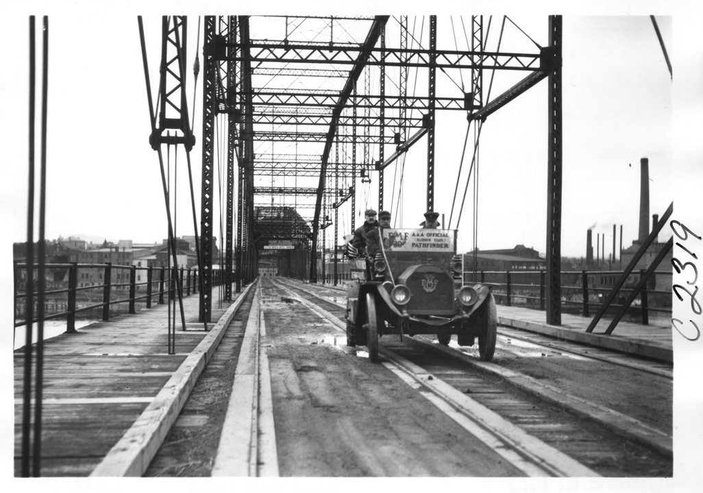 Favorite this☆ E-M-F car crossing a large, iron bridge, on pathfinder tour for 1909 Glidden Tour Description: View of E-M-F car crossing a large, iron girdered bridge, buildings and factories visible on shore, on pathfinding tour for the 1909 Glidden tour. Details Resource ID: EB01g984 Creator: Krohn, William Subject: Glidden Tour (1909) Automobile driving--Competitions--United States Bridges, Iron and steel Automobiles E-M-F Company Photographers--New York (State)--New York Photographic prints Date Issued: 1909-04 Format: 1 photographic print ; 5 x 7 in. Member of: National Automotive History Collection Lazarnick Collection Filing Location: Tours--Glidden Tour, 1909 Negative Number: Negative #C2319 Rights: Physical rights are retained by DPL. Copyright is retained in accordance with U.S. copyright laws.