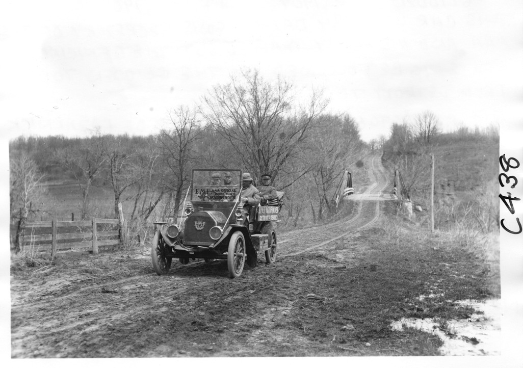 Favorite this☆ E-M-F car on country road, on pathfinder tour for 1909 Glidden Tour Description: View of E-M-F car on dirt road in countryside, wooden bridge in background, on pathfinding tour for the 1909 Glidden tour. Details Resource ID: EB01g988 Creator: Krohn, William Subject: Glidden Tour (1909) Automobile driving--Competitions--United States Rural roads Automobiles E-M-F Company Photographers--New York (State)--New York Photographic prints Date Issued: 1909-04 Format: 1 photographic print ; 5 x 7 in. Member of: National Automotive History Collection Lazarnick Collection Filing Location: Tours--Glidden Tour, 1909 Negative Number: Negative #C438 Rights: Physical rights are retained by DPL. Copyright is retained in accordance with U.S. copyright laws.