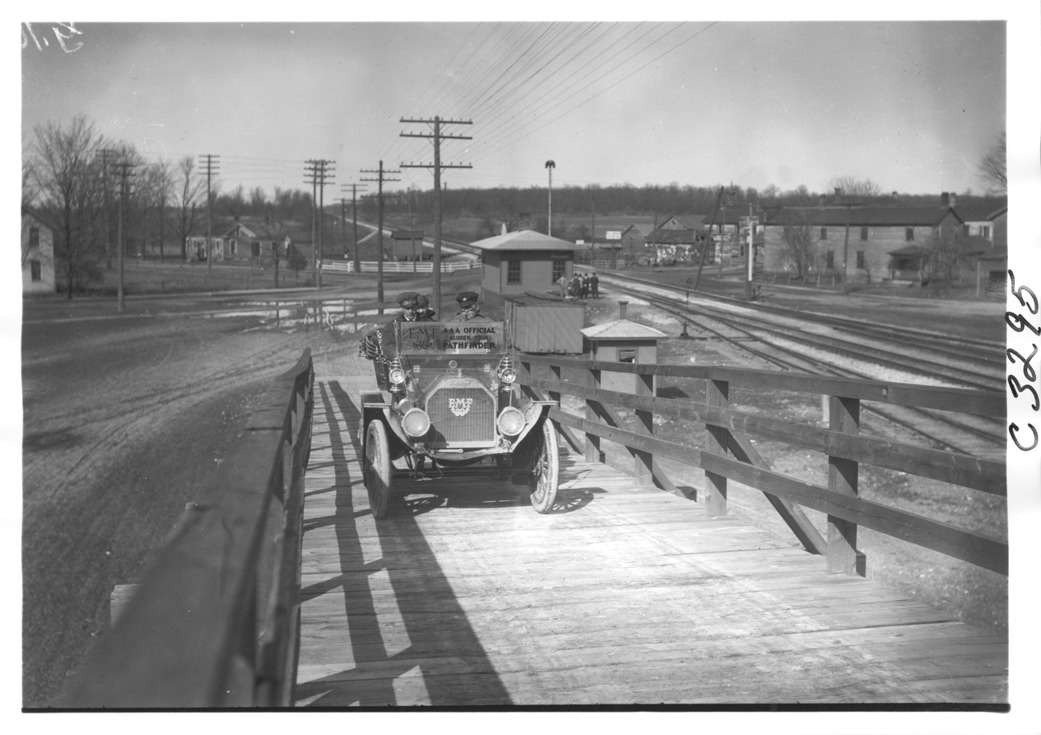Favorite this☆ E-M-F car going up wooden ramp, on pathfinder tour for 1909 Glidden Tour Description: View of E-M-F car on a wooden ramp next to railroad tracks, buildings in background, on pathfinding tour for the 1909 Glidden tour. Details Resource ID: EB01g994 Creator: Krohn, William Subject: Glidden Tour (1909) Automobile driving--Competitions--United States Automobiles E-M-F Company Photographers--New York (State)--New York Photographic prints Date Issued: 1909-04 Format: 1 photographic print ; 5 x 7 in. Member of: National Automotive History Collection Lazarnick Collection Filing Location: Tours--Glidden Tour, 1909 Negative Number: Negative #C3295 Rights: Physical rights are retained by DPL. Copyright is retained in accordance with U.S. copyright laws.