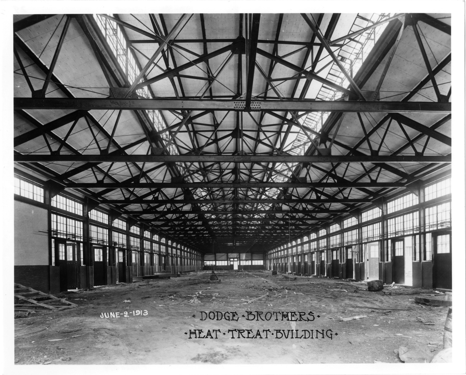 View of the Dodge Brothers heat treat building interior, the image is inscribed "Dodge Brothers Heat Treat Building" and "June-2-1913"; penciled on back "Bldg. #409."