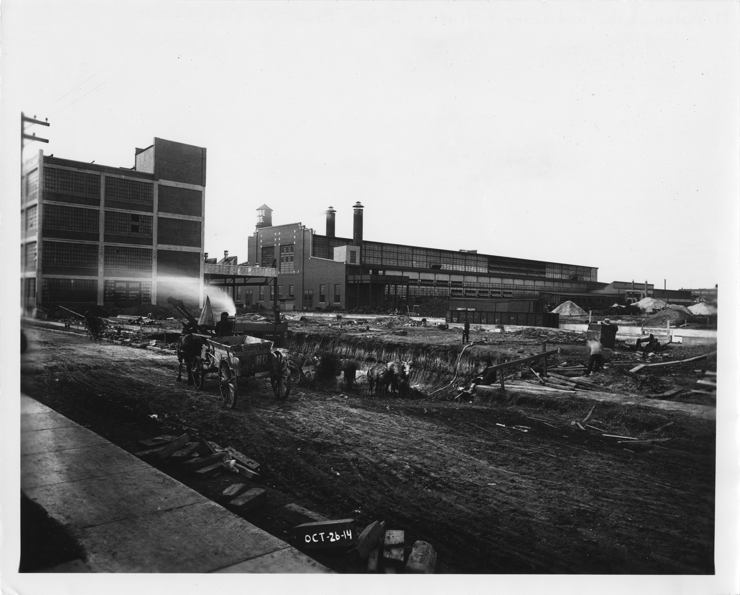 Favorite this☆ Dodge Brothers factory exterior Description: View of the Dodge Brothers factory buildings showing men and horse-drawn wagons at work, the image is inscribed "Oct-26-14." Details Resource ID: EB02a006 Subject: Automobile factories--Michigan--Detroit Dodge automobile Dodge Brothers Photographic prints Date Issued: 1914-10-26 Format: 1 photographic print ; 8 x 10 in. Member of: Burton Historical Collection Negative Number: BHC glass neg. no. 4184 Rights: Physical rights are retained by DPL. Copyright is retained in accordance with U.S. copyright laws.