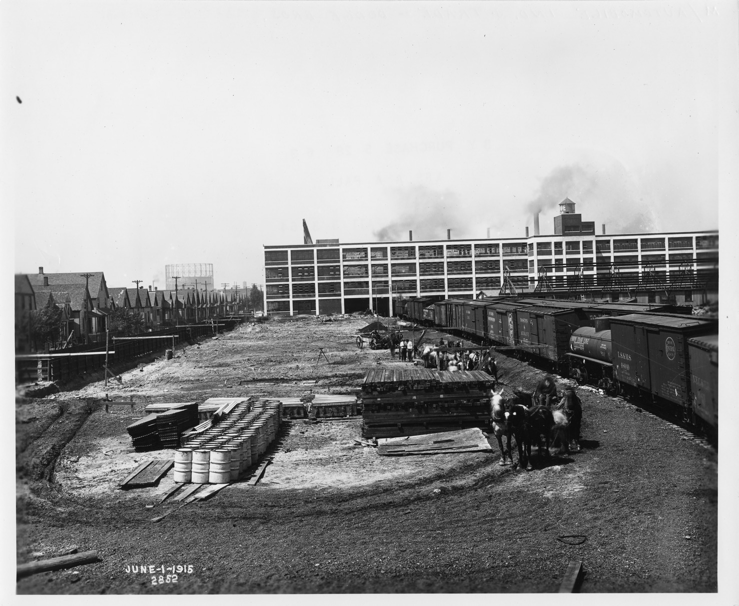 Loading dock area of Dodge Brothers showing railroad cars and horse-drawn wagons outside the building, the image is inscribed "June-1-1915" and "2852."
