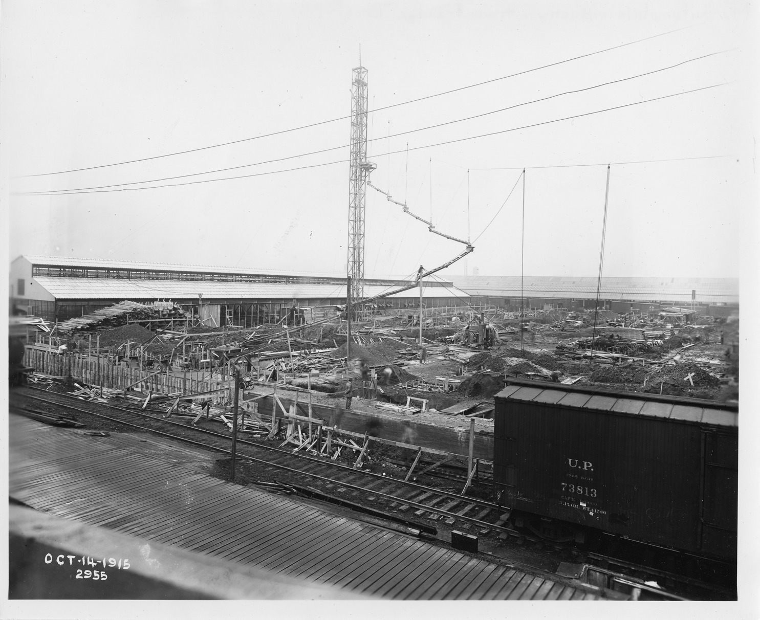 View of the Dodge Brothers pressed steel shop showing a partially completed building and large amounts of construction materials, the image is inscribed "Oct-14-1915" and "2955."