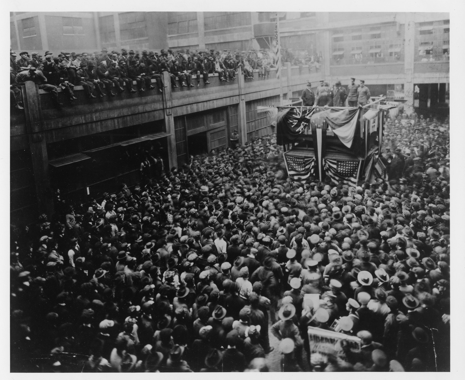 Favorite this☆ Liberty Loan rally at Dodge Brothers during World War I Description: View of a Liberty Loan rally at Dodge Brothers showing a large crowd gathered around the Dodge brothers and other men on an elevated podium. Details Resource ID: EB02a035 Subject: Automobile factories--Michigan--Detroit Dodge Brothers Liberty bonds Photographic prints Date Issued: 1917 (year approximate) Format: 1 photographic print ; 8 x 10 in. Member of: Burton Historical Collection Rights: Physical rights are retained by DPL. Copyright is retained in accordance with U.S. copyright laws.
