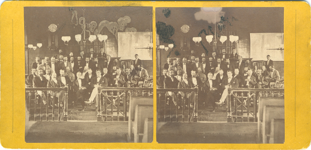 Gold mount. Group photo of Detroit City Council in old City Hall. Handwritten on stereocard back: "Last night of Mr. Aldum and Mr. King in the old City Hall, 1871, photographer unknown."