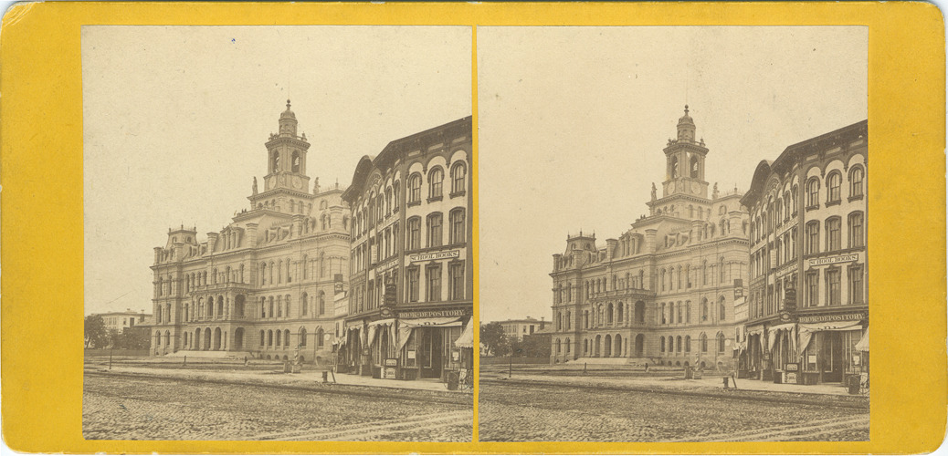 Favorite this☆ Old City Hall and Woodward Avenue Description: Gold mount. View of City Hall and book depository. Printed on stereocard back: "Stereoscopic gems of the city of Detroit and vicinity, photographed by Jex Bardwell." Handwritten on back: "Woodward Ave. front of City Hall, Detroit, 1871." Details Resource ID: EB02c009 Creator: Bardwell, Jex, 1824-1902 Subject: City halls--Michigan--Detroit Streets--Michigan--Detroit Photographers--Michigan--Detroit Stereographs Date Issued: 1871 Format: 1 photoprint on stereocard ; 3.25 x 7 in. Member of: Burton Historical Collection Filing Location: D/Buildings-City Hall, 1871-date Rights: Physical rights are retained by DPL. Copyright is retained in accordance with U.S. copyright laws.