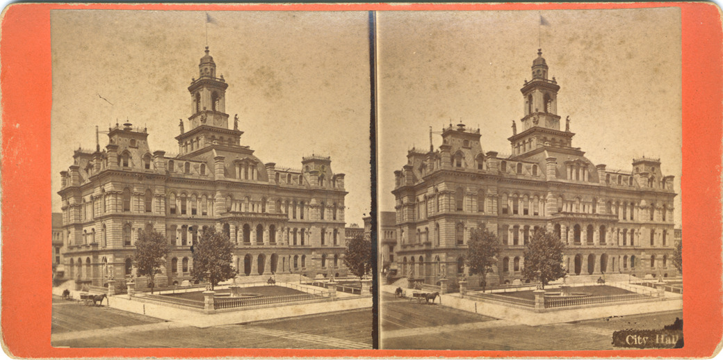 Orange mount. View of City Hall. Printed on front of stereocard: "City Hall." Printed on stereocard back: "Views of Detroit and vicinity, for sale by John Willyoung, publisher, bookseller and stationer, 189 Woodward Ave., Detroit, Mich., dealers in Sunday School supplies." Handwritten on back: "Erected 1871, before the statues of Cadillac et. al in City Hall."