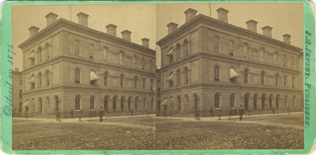 Green mount. View of post office with men standing in front. Printed on front of sterocard: "Detroit in 1875, J.A. Jenney, publisher." Printed on stereocard back: "Detroit scenery, no. 22, post office, photographed and published by J.A. Jenney, No. 129 Jefferson Avenue." Handwritten on back: "Detroit buildings, federal, post office (1860), old post office n.w. cor. Griswold & Larned St., 1875, cornerstone laid, May 18, 1858, formally opened Jan. 30, 1860, Farmer p. 882-883, Burton Historical Collection has neg., Silas Farmer Collection."