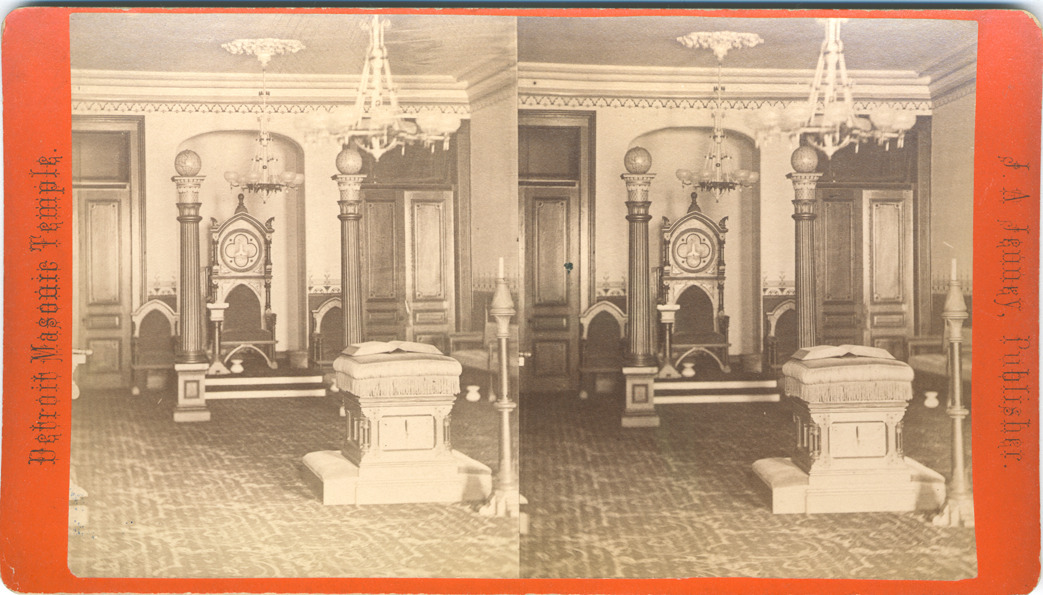 Orange mount. Interior view of Masonic Temple room with throne and book pedestal. Printed on front of stereocard: "Detroit Masonic Temple, J.A. Jenney, publisher." Printed on stereocard back: "Detroit Masonic Temple, 4. Blue lodge room west, photographed by aid of a powerful calcium light, by J.A. Jenney, publisher of Detroit & Michigan stereoscopic views." Handwritten on back: "Detroit buildings, Masonic Temple, Silas Farmer Collection."
