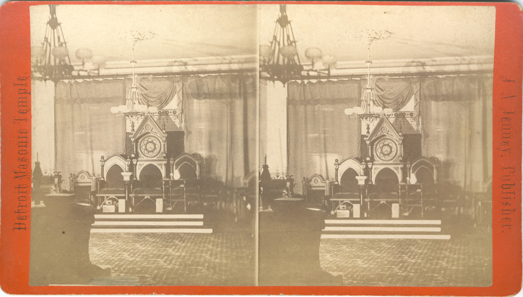 Orange mount. Interior view of Masonic Temple room with thrones and book pedestal. Printed on front of stereocard: "Detroit Masonic Temple, J.A. Jenney, publisher." Printed on stereocard back: "Detroit Masonic Temple, 3. Blue lodge room, east, photographed by aid of a powerful calcium light, by J.A. Jenney, publisher of Detroit & Michigan stereoscopic views."