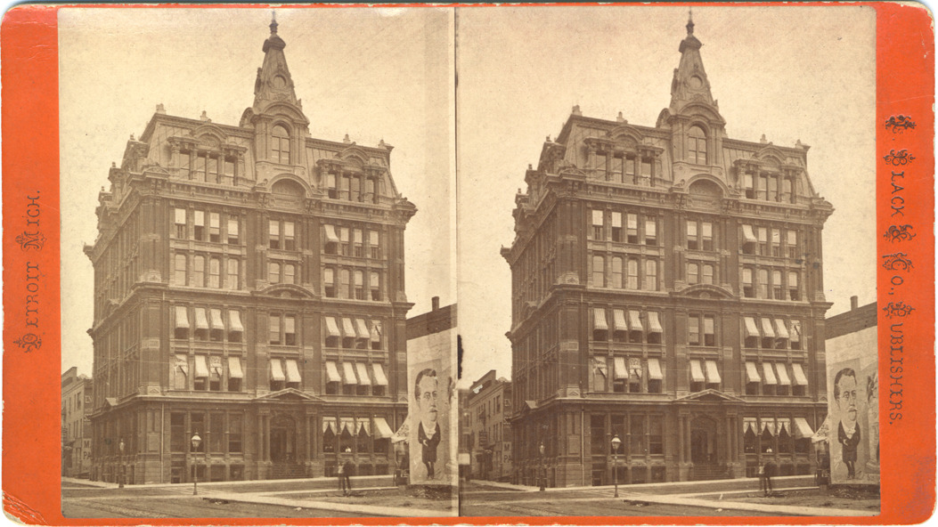 Orange mount. Front view of the Newberry and McMillan building, large caricature of Teddy Roosevelt covers side of building across the street. Printed on front of stereocard: "Detroit, Mich., L. Black & Co., publishers." Handwritten on stereocard back: "1880, S.E. cor. Griswold and Larned."