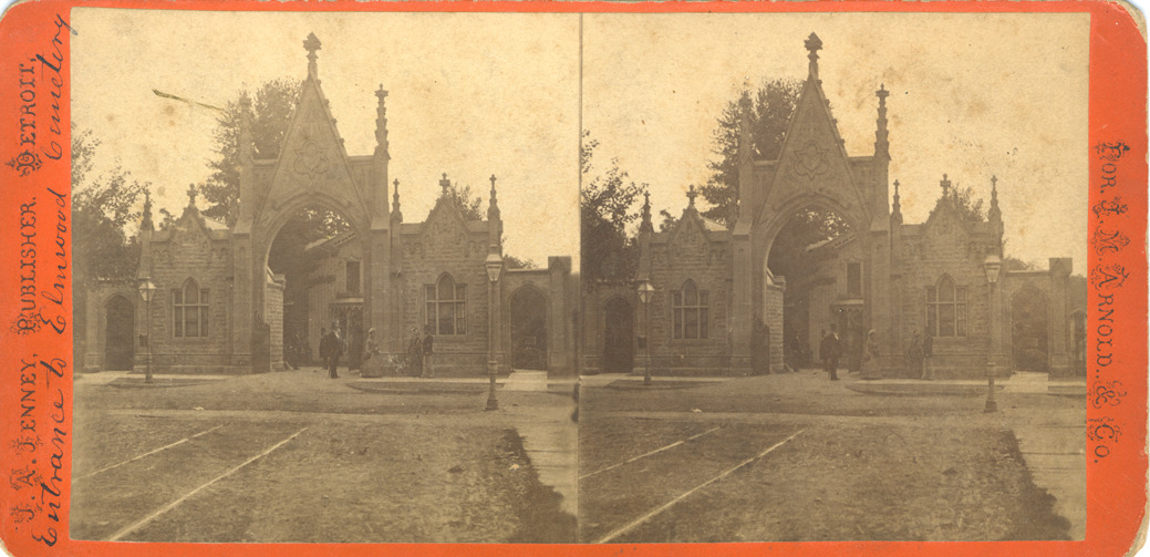 Orange mount. View of the entrance to Elmwood Cemetery. Printed on front of stereocard: "J.A. Jenney, publisher, Detroit, for M. Arnold & Co." Handwritten on front: "Entrance to Elmwood Cemetery." Printed on stereocard back: "Detroit scenes, no. 66. Entrance Elmwood Cemtery, photographed and published by J.A. Jenney, Room no. 20 Merrill Hall, corner Jefferson and Woodward Avenues, publisher of general Michigan stereoscopic views, special attention given to photographing residences, machinery, etc."