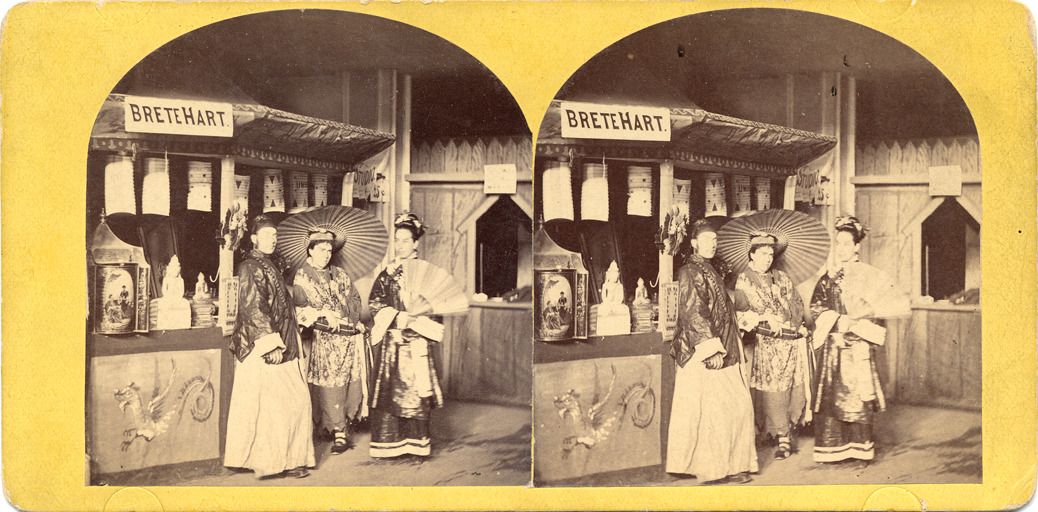 Gold mount. Dome topped. Exhibit booth representing Bret Harte's novel, Heathen Chinee. Three people in Chinese dress stand in front of booth decorated with laterns and statues under a sign labeled, "Brete Hart." Printed on stereocard back: "Views of the booths as shown in the Author's Carnival, held in Detroit at Young Men's Hall, June 7th to 12th, 1875 for the benefit of the Young Men's Christian Association and Home of the Friendless, Heathen Chinee, Brete Harte, photographed and published by Jex Bardwell for the associations, copyright 1875, by Jex Bardwell."