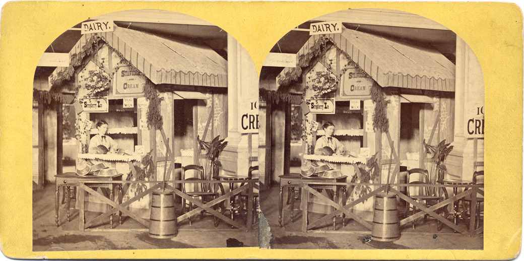 Gold mount. Dome topped. Exhibition booth representing the dairy industry. Booth resembles a storefront, a woman stands in front of booth with a butter churn. Printed on stereocard back: "Views of the booths as shown in the Author's Carnival, held in Detroit at Young Men's Hall, June 7th to 12th, 1875 for the benefit of the Young Men's Christian Association and Home of the Friendless, Dairy, Home Messenger Cook-book, photographed and published by Jex Bardwell for the associations, copyright 1875, by Jex Bardwell."
