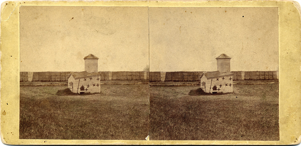 White mount. View of a hot shot furnace in front of fortification. Printed on stereocard back: "Photographed and published by J.J. Bardwell, 162 Jefferson, Avenue, Detroit." Handwritten on back: "Magazine?, hot-shot furnace see F [Detroit Free Press] June 4, 1861."