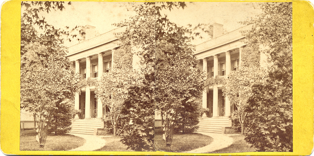 Gold mount. View of home with columned porches across the front, trees and bushes on either side. Printed on stereocard back: "Photographic sketches in and about the city of Detroit consisting of street and marine views, public buildings, churches, monumental and other objects of interest, photographed and published by Jex Bardwell." Handwritten on back: "530 Woodward, S.E. corner Woodward & Watson, Cp. Pater house with Mansard roof, bay & towers, razed 1876.