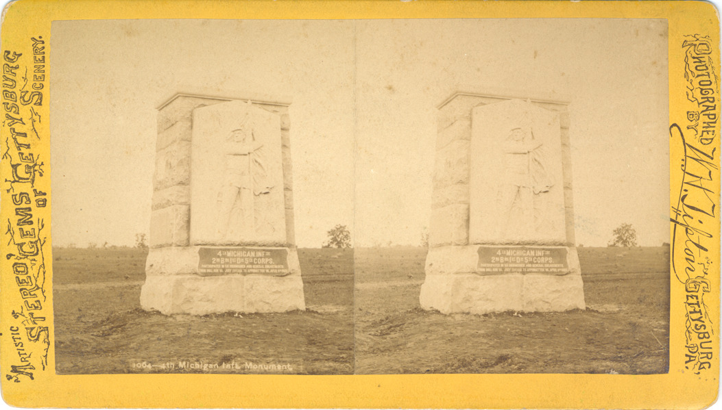 Yellow mount. View of large stone monument with a relief of a soldier holding a flag on the face of it and a plaque dedicating it to the 4th Michigan Infantry. Printed on front of stereocard: "Artistic stereo gems of Gettysburg scenery, photographed by W.H. Tipton, Gettysburg, Pa."