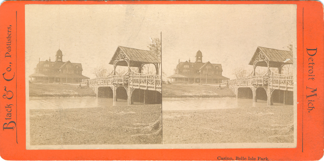 Favorite this☆ Casino and bridge on Belle Isle Park Description: Orange mount. View of rustic wooden bridge with casino in background on Belle Isle Park. Printed on front of stereocard: "Casino, Belle Isle Park, Detroit, Mich., Black & Co., publishers." Details Resource ID: EB02c134 Subject: Casinos--Michigan--Detroit Wooden bridges--Michigan--Detroit Canals--Michigan--Detroit Belle Isle Park (Detroit, Mich.) Stereographs Publisher: L. Black & Co. Date Issued: Unknown year Format: 1 photoprint on stereocard ; 3.5 x 7 in. Member of: Burton Historical Collection Filing Location: D/Parks-Belle Isle, rustic bridges Note (Content): Silas Farmer Collection Rights: Physical rights are retained by DPL. Copyright is retained in accordance with U.S. copyright laws.
