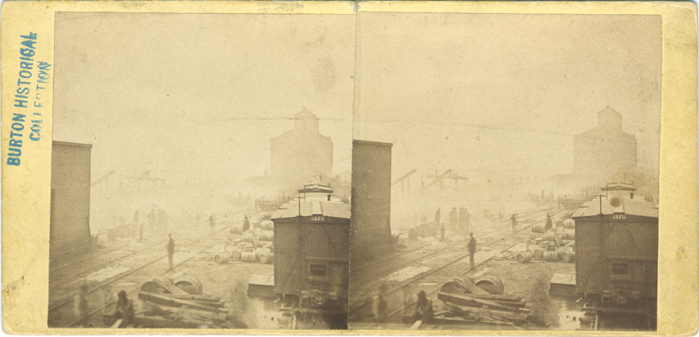 Favorite this☆ Michigan Central Railroad Station Description: White mount. Bird's-eye view of Michigan Central Railroad, train on tracks to the right and men on empty tracks to the left. Handwritten on stereocard back: "After fire of Oct. 18, 1865." Photo is faded. Details Resource ID: EB02c145 Subject: Michigan Central Railroad Company Railroads--Michigan--Detroit Stereographs Date Issued: 1865 Format: 1 photoprint on stereocard ; 3.25 x 7 in. Member of: Burton Historical Collection Filing Location: D/Railroads-Michigan Central Rights: Physical rights are retained by DPL. Copyright is retained in accordance with U.S. copyright laws.
