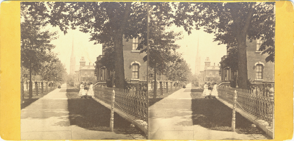 Goldenrod mount. View of Fort Street with three women standing in front of building and sidewalk to left. Printed on stereocard back: "Stereoscopic gems of the city of Detroit and vicinity photographed by Jex Bardwell." Handwritten on back: "Looking east from corner of 5th, 1871."