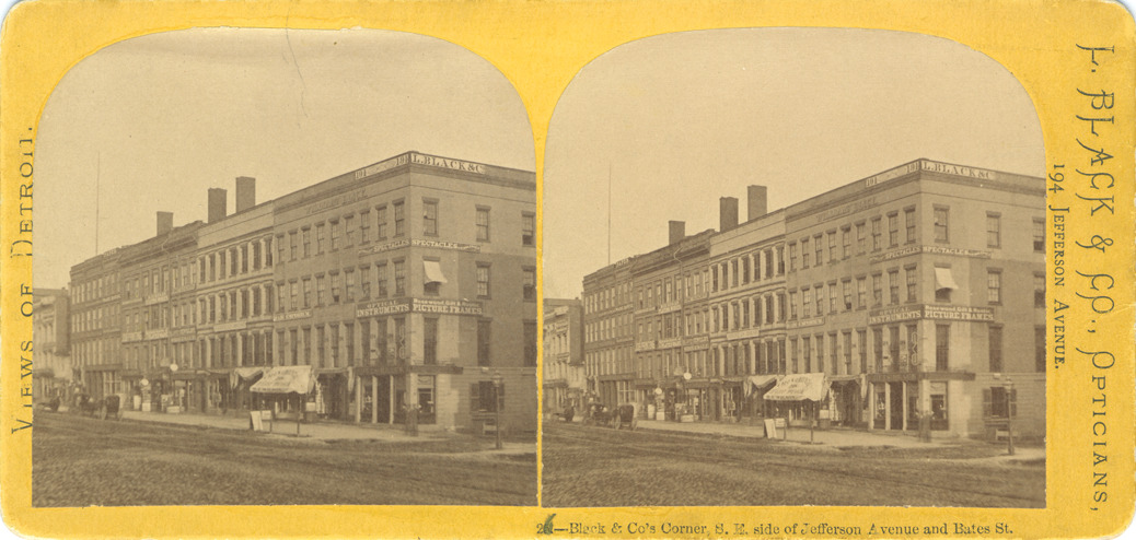 Goldenrod mount. Dome topped. View of businesses on one side of Jefferson Avenue. Printed on front of stereocard: "Views of Detroit, 26. Black & Co's corner, s.e. side of Jefferson Avenue and Bates St., L Black & Co., opticians, 194 Jefferson Avenue."
