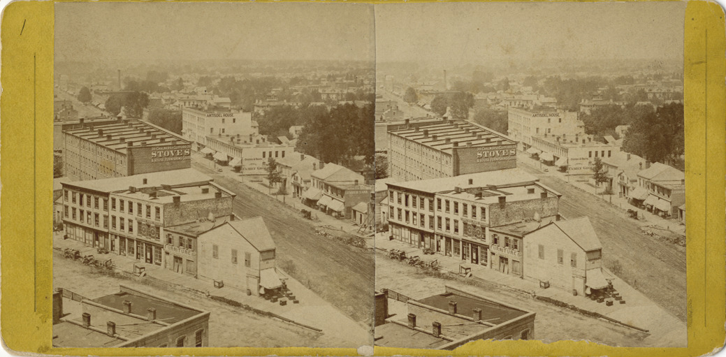 Goldenrod mount. Bird's-eye view of businesses along Michigan Avenue and Lafayette. Handwritten on stereocard back: "1873, photograph taken by Jex Bardwell, see: Detroit News Dec. 29, 1907, illustrated magazine section p. 6-7."