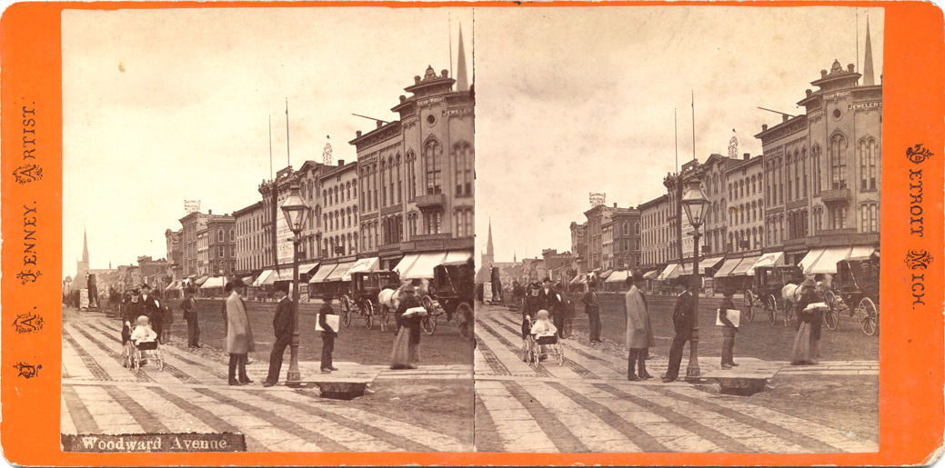 Favorite this☆ Group of people on Woodward Avenue Description: Orange mount. Group of people including a newsboy and a woman with a buggy on Woodward Avenue, businesses in background. Printed on front of stereocard: "Woodward Avenue, Detroit, Mich., J.A. Jenney, artist." Details Resource ID: EB02c186 Creator: Jenney, J.A. (James A.) Subject: Woodward Avenue (Mich.) Streets--Michigan--Detroit Commercial buildings--Michigan--Detroit Newspaper carriers--Michigan--Detroit Photographers--Michigan--Detroit Stereographs Date Issued: Unknown year Format: 1 photoprint on stereocard ; 3.5 x 7 in. Member of: Burton Historical Collection Filing Location: D/Streets-Woodward Ave. Rights: Physical rights are retained by DPL. Copyright is retained in accordance with U.S. copyright laws.