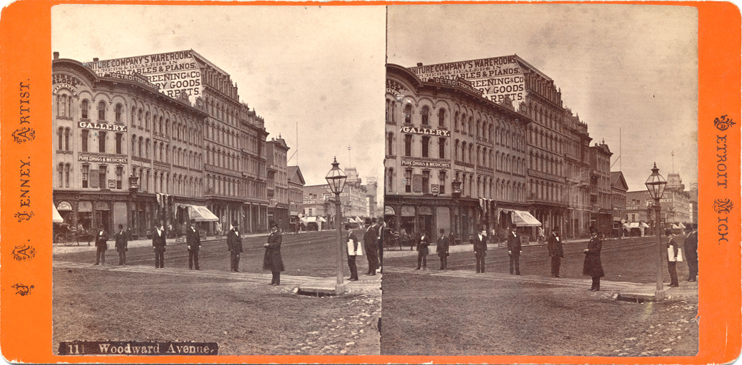 Orange mount. View of a line of men in bowler hats and a newspaper boy standing across Woodward Avenue with businesses in background. Printed on front of stereocard: "11. Woodward Avenue, Detroit, Mich., J.A. Jenney, artist."