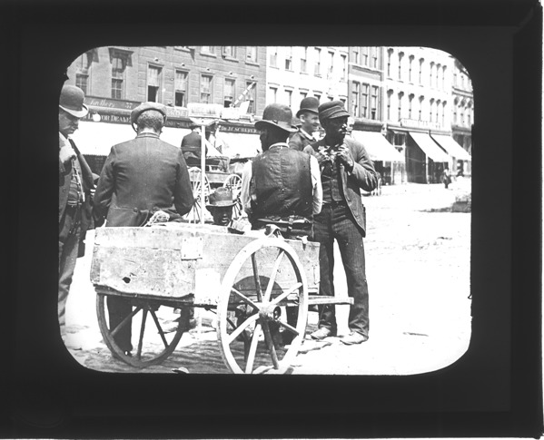 Favorite this☆ Men with a wooden wagon Description: Group of men stand around a small wooden cart, market and other businesses are in the background. Recorded in lantern slide ledger: "D/Views-Market (at Cadillac Square?)." Details Resource ID: EB02c221 Subject: African American men--Michigan--Detroit Commercial buildings--Michigan--Detroit Lantern slides Date Issued: Unknown year Format: 1 transparency : glass ; 3.25 x 4 in. Member of: Burton Historical Collection Negative Number: BHC lantern slide no. 18 Rights: Physical rights are retained by DPL. Copyright is retained in accordance with U.S. copyright laws.