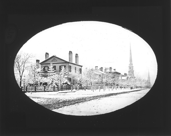 View of the John Palmer residence on the southwest corner of Griswold and Fort St. in winter, with trees in foreground, church steeples can be seen in background. Lantern slide mount has an oval opening. Recorded in lantern slide ledger: "B/Palmer, John, residence, 1823-69."