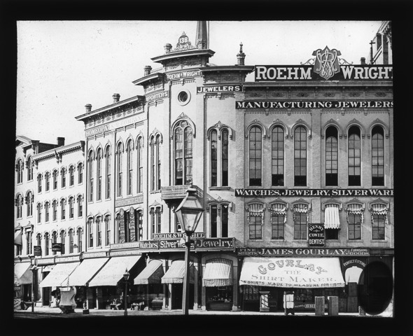 Favorite this☆ Roehm & Wright Jewelers Description: View of the Roehm & Wright jewelers, with other businesses at the Coyle block, Woodward at Michigan. Recorded in lantern slide ledger: "D/Streets-Coyle Block, Woodward at Michigan, Roehm & Wright Jewellers." Details Resource ID: EB02c280 Subject: Jewelers--Michigan--Detroit Commercial buildings--Michigan--Detroit Lantern slides Date Issued: Unknown year Format: 1 transparency : glass ; 3.25 x 4 in. Member of: Burton Historical Collection Negative Number: BHC lantern slide no. 76 Rights: Physical rights are retained by DPL. Copyright is retained in accordance with U.S. copyright laws.