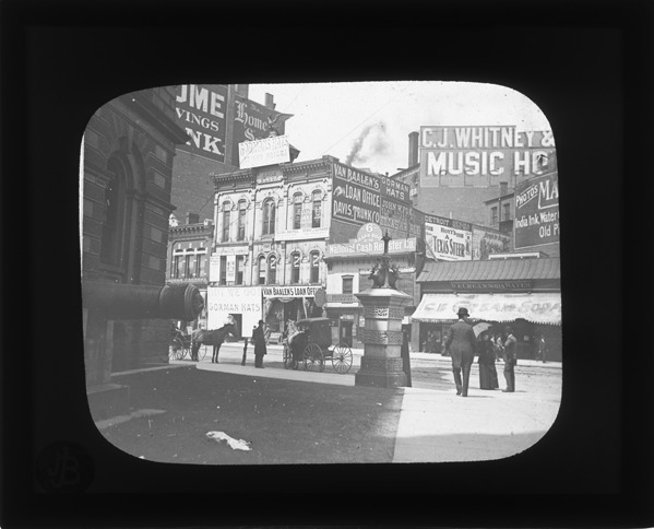 Favorite this☆ Eagle Block businesses on Michigan Avenue Description: View of the Eagle Block on Michigan Avenue, with businesses such as Van Baalen's loan office and Gorman's hats, C.J. Whitney & Co's Music House is in background. Recorded in lantern slide ledger: "D/Streets-Michigan, C. J. Whitney & Co Music House." Details Resource ID: EB02c292 Creator: Bardwell, Jex, 1824-1902 Subject: Commercial buildings--Michigan--Detroit Streets--Michigan--Detroit Photographers--Michigan--Detroit Lantern slides Date Issued: Unknown year Format: 1 transparency : glass ; 3.25 x 4 in. Member of: Burton Historical Collection Negative Number: BHC lantern slide no. 87; BHC glass neg. no. 1480 Rights: Physical rights are retained by DPL. Copyright is retained in accordance with U.S. copyright laws.