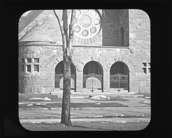 View of the side of Central Christian church on the corner of Ledyard and Second, showing a large, round stained glass window above three gated arches. Recorded in lantern slide ledger: "D/Churches-Central Christian, three arched gates, circle window, Ledyard & Second."