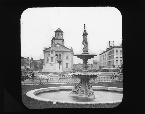 View of the Detroit City Hall with the Soldiers' and Sailors' Monument directly in front of it, a fountain with the statue of a woman on top and winged horses at bottom in foreground of image. Recorded in lantern slide ledger: "D/Buildings-City Hall (old)."