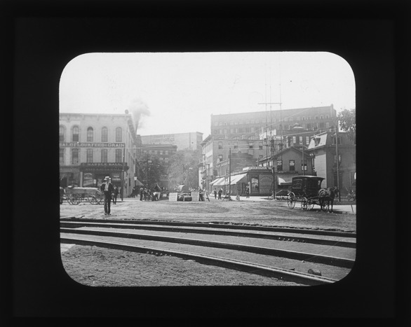 View of Gratiot Avenue with Marble Hall and other businesses in background and street car tracks in foreground. Recorded in lantern slide ledger: "D/Streets-Gratiot, street car track, Marble Hall."