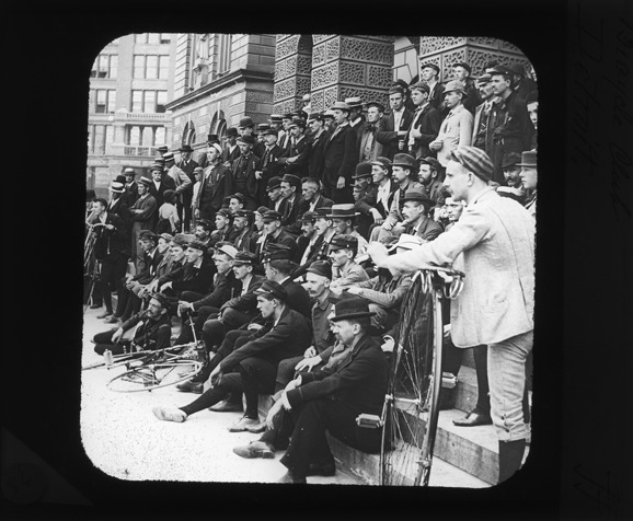 Favorite this☆ Group photograph of members of the Bicycle Club in front of Detroit City Hall Description: Group photo of the members of the Bicycle Club on the steps of the Detroit City Hall. Details Resource ID: EB02c350 Creator: Bardwell, Jex, 1824-1902 Subject: Athletic clubs--Michigan--Detroit Cyclists--Michigan--Detroit City halls--Michigan--Detroit Portraits, Group--Michigan--Detroit Photographers--Michigan--Detroit Lantern slides Date Issued: Unknown year Format: 1 transparency : glass ; 3.25 x 3.75 in. Member of: Burton Historical Collection Negative Number: BHC lantern slide no. 156 Rights: Physical rights are retained by DPL. Copyright is retained in accordance with U.S. copyright laws.