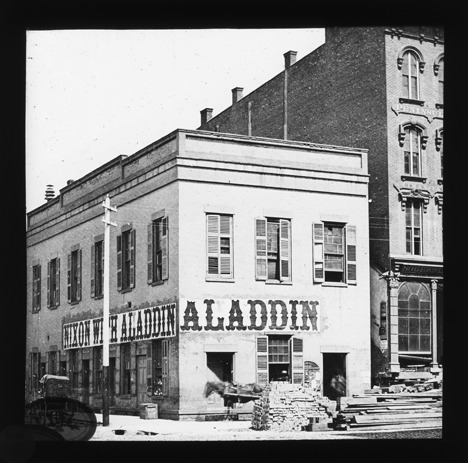 Building materials and a horse stand in front of a building with a sign on each exposed side, the sign in front reads, "Aladdin" and the sign on the side reads, "Nixon with Aladdin." The building is on the southeast corner of Congress and Griswold. Recorded in lantern slide ledger: "D/Buildings-County (site), S.E. corner Congress and Griswold."